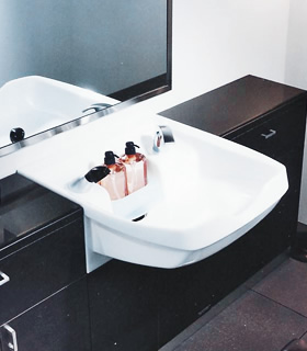 アクリル系人工大理石板を高精度で加工し、ボウルやサイドガード等を接着する工法。加工面の美仕上、接着継ぎ目のシームレス化により一体成形のような自然な仕上がりを実現。
